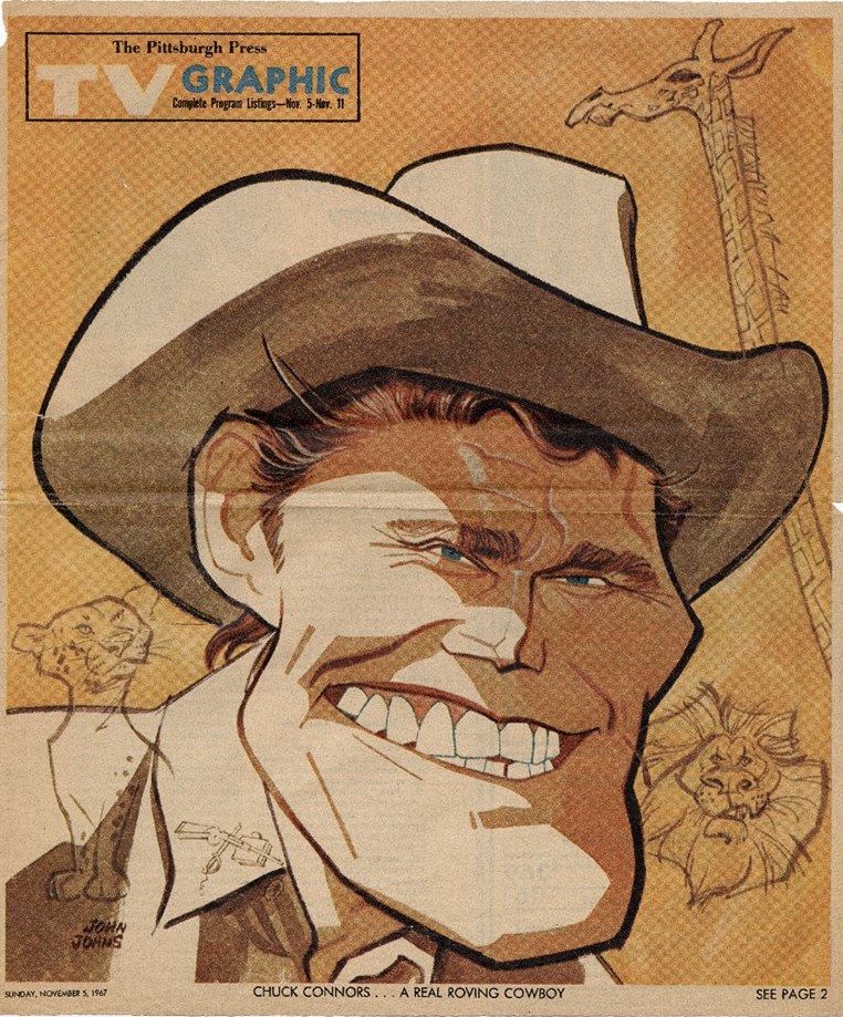 Press, drawing caricatures, spot drawings, even maps, all on demand. Beginning around 1960, towards the end of each week, finally came the big perk for him: creating a full color cover image-- usually a current TV star, for their Sunday TV GRAPHIC magazine. Johns usually had little time to render these covers, perhaps several hours from start to finish, and in some cases less than an hour, yet for the next decade, he somehow managed to turn out over 500 beautiful covers, vivid, lush and funny images, some far more weirdly distorted than others. In fact he was a master of distortion. It became a ritual for many in Pittsburgh to look forward to the John Johns TV caricature every Sunday.