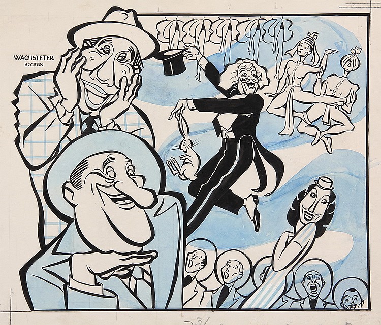 On March 24, the Thomaston Place Auction Galleries in Thomaston Maine will host a one-day auction featuring "The Lost Drawings of George Wachsteter", a mind-boggling collection of original art spanning four decades from the estate of Wachsteter, at one time one of the most celebrated caricaturists of the mid-twentieth century, now all but virtually forgotten: